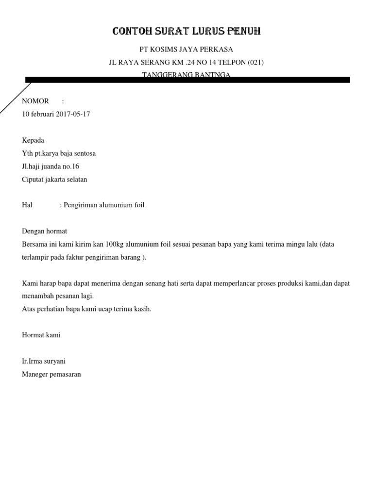Contoh surat lurus penuh. Contoh surat full block style kebutuhan surat menyurat di era sekarang ini memang sangatlah penting baik itu surat dalam bentuk lembaran kertas maupun surat dalam bentuk digital. Bentuk surat yang paling umum digunakan salah satunya adalah bentuk full block style atau bisa juga disebut bentuk lurus penuh. Jlprapanca baru raya no35 jakarta selatan telp0217277722 nomor. Lurus penuh full block style bentuk surat lurus penuh adalah yang paling mudah dilakukan karena bentuk surat ini pengetikanpenulisannya dari awal sampai akhir dimulai dari rata sisi kiri. Contoh surat full block style bentuk surat ini disebut juga dengan surat bentuk lurus penuh. Sebab cara penulisannya sangat khas dan terlihat.