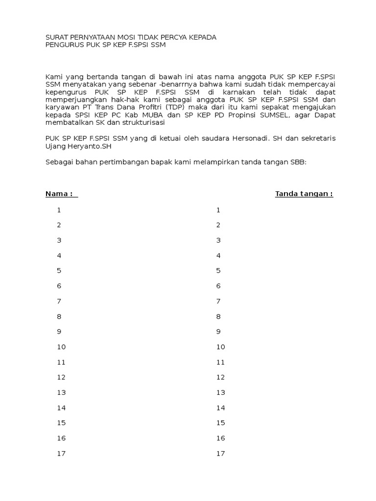 Admin blog contoh seputar surat 2019 juga mengumpulkan gambar gambar lainnya terkait contoh surat mosi tidak percaya kepada pimpinan dibawah ini. Kami yang bertanda tangan di bawah ini atas nama anggota puk sp kep fspsi ssm menyatakan yang sebenar benarrnya bahwa kami sudah tidak mempercayai kepengurus puk sp kep fspsi ssm di karnakan telah tidak dapat memperjuangkan hak hak kami sebagai anggota puk sp kep fspsi ssm dan karyawan pt trans dana profitri tdp.