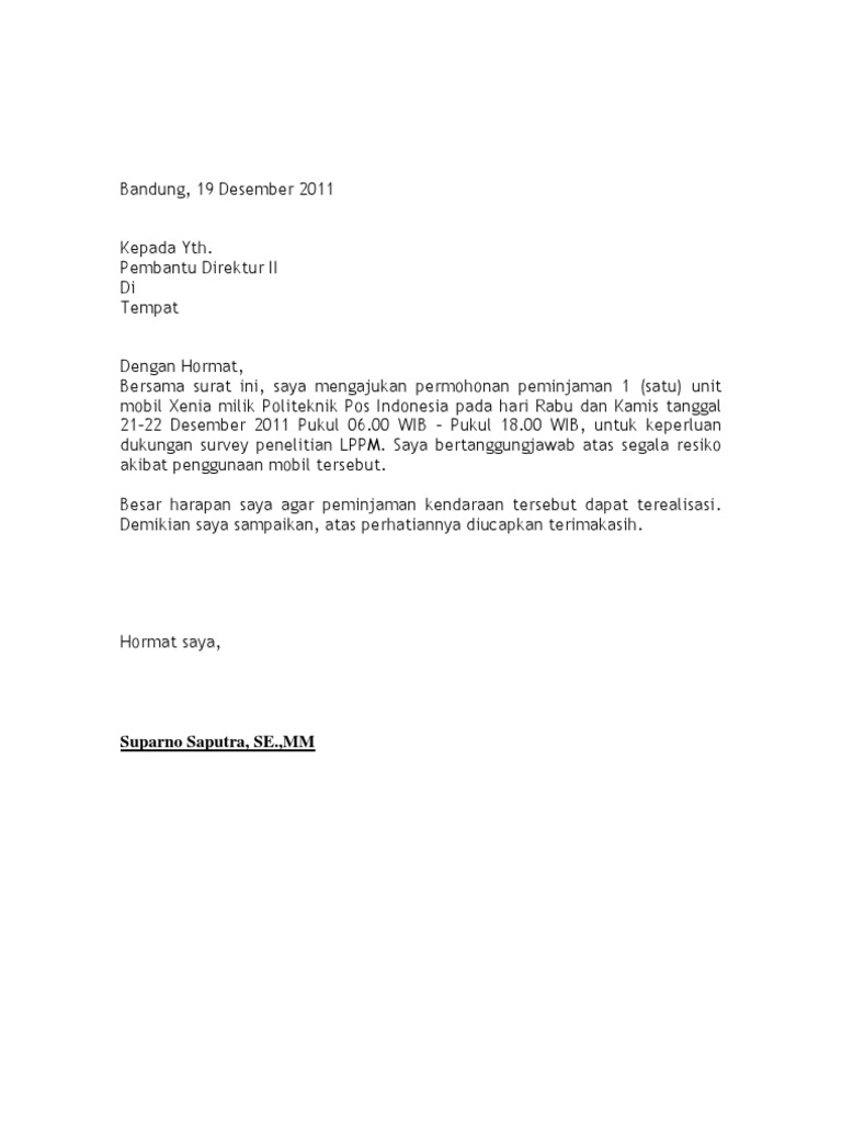 Demikian surat permohonan peminjaman mobil ini saya buat dengan sebenar benarnya. Pembantu direktur ii di tempat dengan hormat bersama surat ini saya mengajukan permohonan peminjaman 1 satu unit mobil xenia milik politeknik pos indonesia pada hari rabu dan kamis tanggal 21 22 desember 2011 pukul 0600 wib pukul 1800 wib untuk keperluan dukungan survey penelitian lppm. Besar harapan saya untuk terkabulnya permohonan tersebut atas segala perhatian bapakibu kami ucapkan terima kasih. 10bem lp3ivii2013 23 juli 2013. Contoh form peminjaman kendaraan perusahaan by antoman2. Hanya saja anda menyertakan permohonan untuk perminjaman mobil tersebut di bagian isinya.