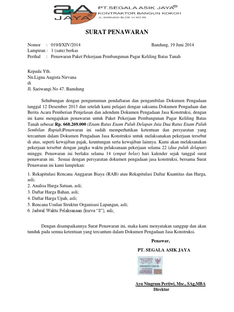 Sebagai informasi surat penawaran harga ini kami ambil dari dokumen lelang pekerjaan konstruksi dengan sumber dana apbn tahun 2020. Di kankim kami menyuguhkan sejumlah contoh surat penawaran harga jasa konstruksi untuk menambah inspirasi dalam membuat suratpenawaran bagi perkembangan bisnis anda terima kasih telah mengunjungi contoh surat penawaran harga jasa konstruksi dalam ide desain penawaran yang di posting oleh. Jika kamu sedang membutuhkan contoh surat penawaran harga proyek kami akan berikan format surat penawaran sebagai referensi. Berikut ini contoh surat penawaran proyek yang dibuat oleh pemborong kepada pemilik bangunan atau oleh sub kontraktor kepada general kontraktor surat ini perlu dibuat sebaik mungkin agar owner tertarik untuk bekerjasama melakukan kontrak kerja konstruksi. Contoh surat penawaran harga. Contoh surat penawaran surat penawaran yaitu surat yang ditulis guna menyampaikan maksud suatu perusahaan untuk menjalin kerjasama dengan perusahaan lainnya.