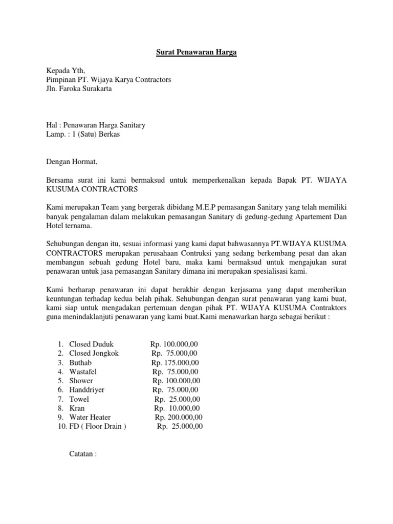 Contoh surat penawaran surat penawaran merupakan surat yang dibuat untuk menjalin sebuah kerjasama atau menawarkan barangjasa pada suatu perusahaan ke perusahaan lainnya. Umumnya surat penawaran digunakan oleh perusahaan perusahaan penyaluran dalam hal ini distributor. Selamat datang kembali di situs kami para pembaca sekalian. Pada artikel kali ini kita akan membahas mengenai contoh surat penawaran barang dan harga lengkapsebagai informasi surat penawaran barang dan hargaadalah surat yang dibuat dan ditujukan kepada suatu perusahaan yang tujuannya yaitu untuk menawarkan suatu barang atau produk ke perusahaan tersebut beserta detail harganya. Sehingga dengan begitu calon pembeli jadi tahu berapa harga barang servis pelayanannya persyaratan jual beli dan lain lain. Surat penawaran seringkali berbentuk formal dan dengan jelas juga mencantumkan rincian harga juga barang yang ditawarkan akan dijual.