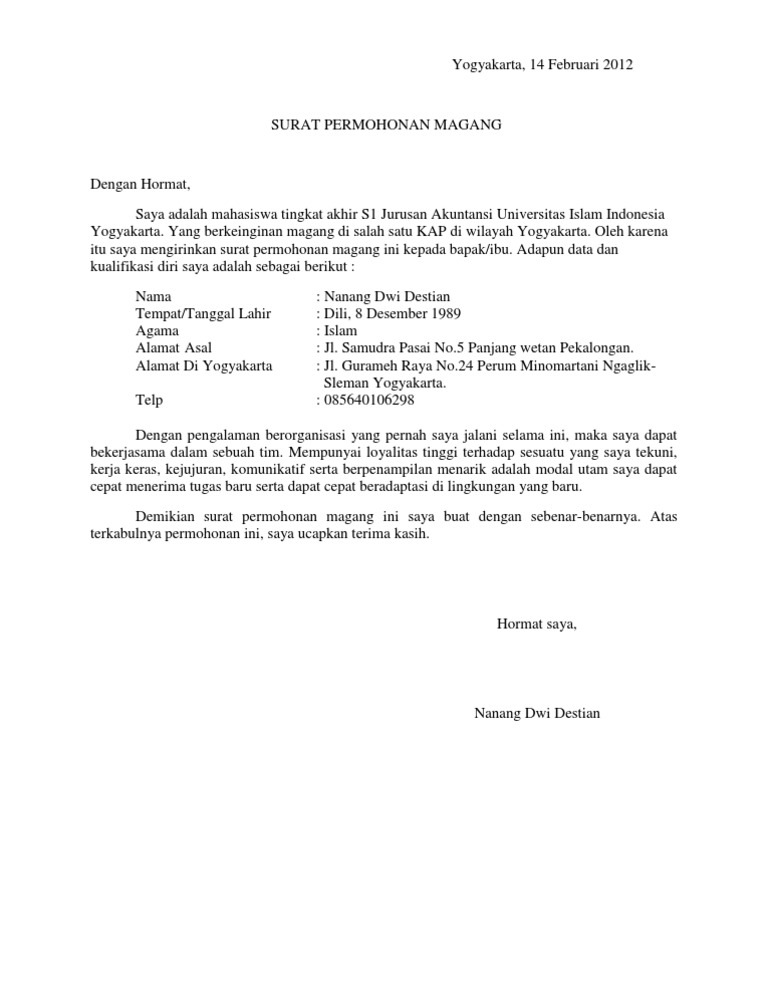 Yogyakarta 17 september 2017 perihal. Setelah pada postingan sebelumnya kami telah memberikan contoh surat pengalaman kerja referensi paklaring rekomendasi pada artikel kali ini kami akan memberikan contoh surat keterangan magang kerja dari perusahaan. Contoh surat permohonan magang kerja perusahaan. Surat pengantar praktik kerja no. Walaupun surat ini sama sama dikeluarkan oleh perusahaan tapi isi dari surat keterangan magang ini berbeda dari surat pengalaman kerja.