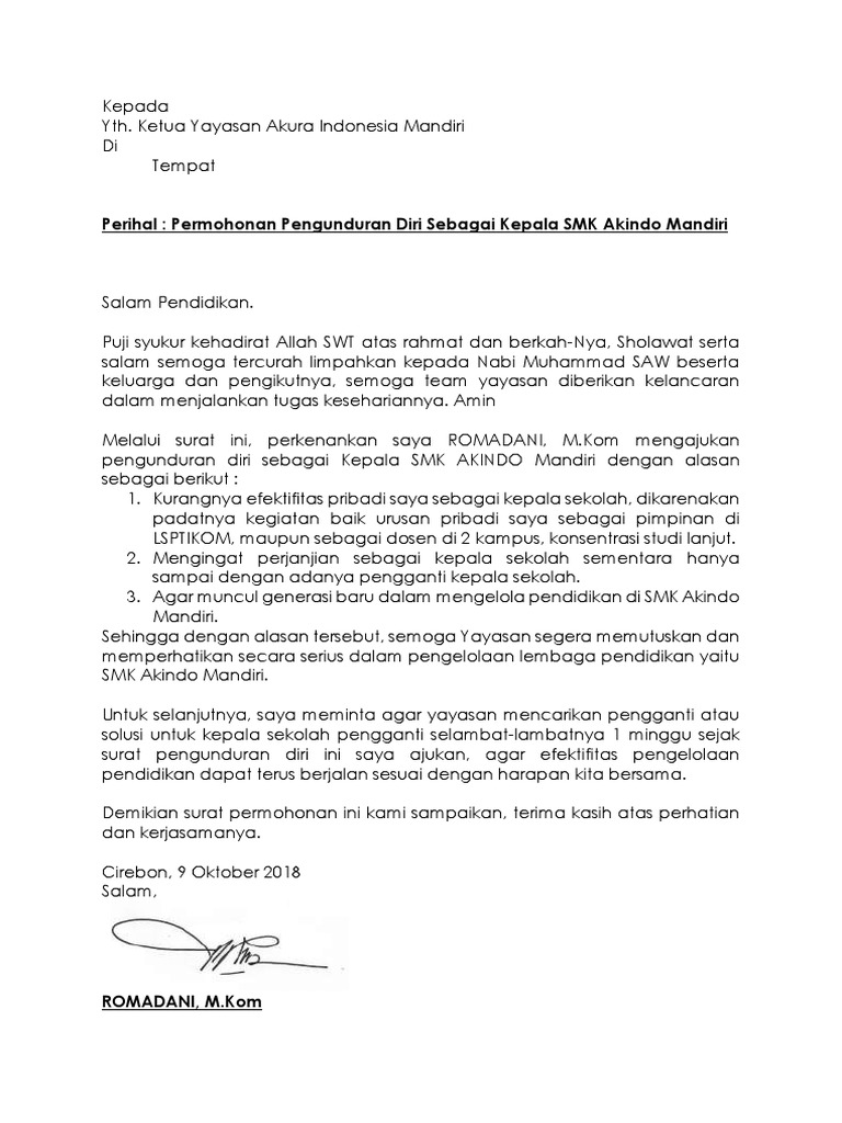 Sebagai guru anda harus membuat surat pengunduran diri sebaik mungkin agar tetap terlihat baik dan professional di depan mata atasan dan guru guru lainnya. Kulon progo 28 september 2017. Contoh surat pengunduran diri doc. Menulis surat pengunduran diri dari sekolah sebagai siswamurid adalah hal yang sangat mudah. Contoh surat pengunduran diri dari jabatan surat pengunduran diri sering kali menjadi suatu hal membuat banyak orang merasa dilematisbukan hanya karena kenangan atau kebersamaan yang telah terjalin diperusahaan saja surat ini tidak sama dengan contoh surat lamaran kerja karena lebih menguras emosi. Download contoh surat pengunduran diri doc.