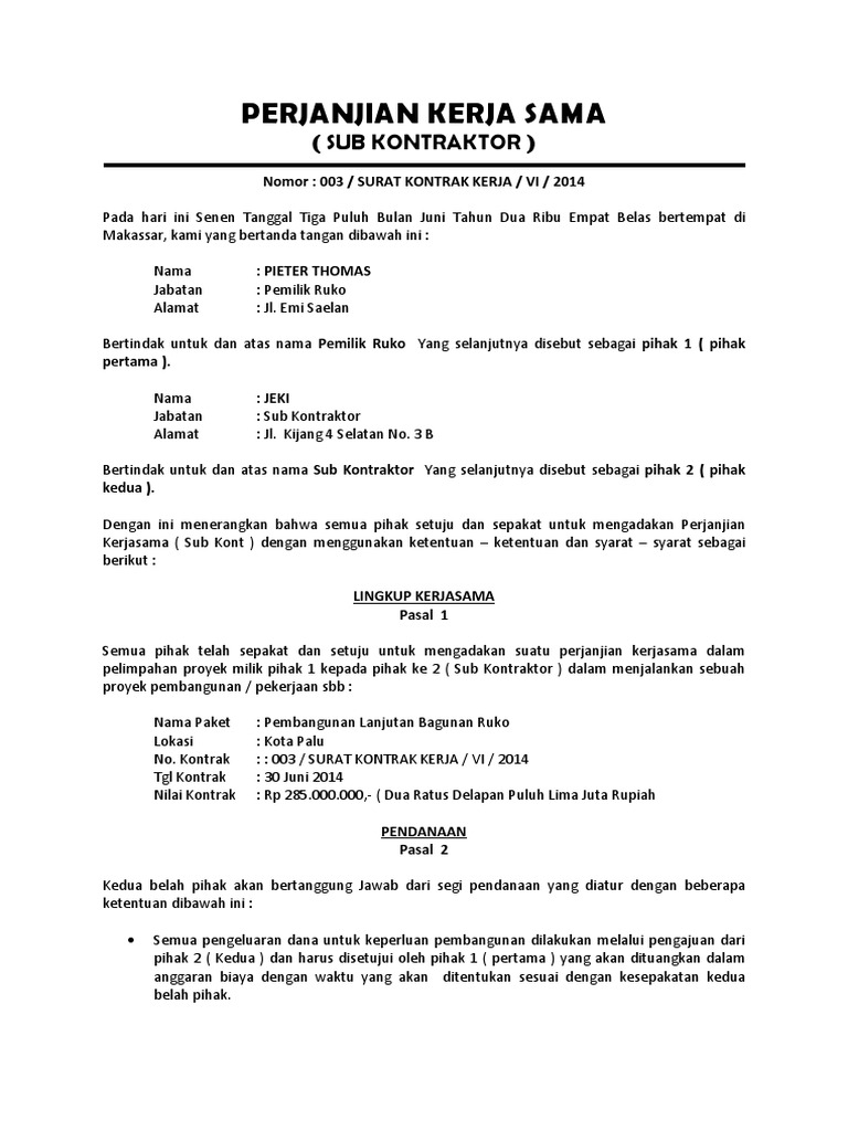 Koleksi admin mengenai contoh surat perjanjian subkontraktor doc. Lamudi pun mengutip beberapa bagian penting dari contoh surat perjanjian sewa rumah yang dapat anda unduh dari link di akhir artikel ini. Contoh surat perjanjian suatu kontrak atau perjanjian adalah suatu peristiwa di mana seorang berjanji kepada orang lain atau di mana dua orang itu saling berjanji untuk melaksanakan suatu hal. Demikianlah 2 contoh surat kontrak perjanjian pembangunanuntuk mendapatkan contoh lain bentuk surat perjanjian yang sesuai dengan kebutuhan anda silahkan lihat kumpulan contoh surat perjanjian kami yang lain dalam kategori surat perjanjian. Melalui kontrak terciptalah perikatan atau hubungan hukum yang menimbulkan hak dan kewajiban pada masing masing pihak yang membuat kontrak. Admin blog contoh seputar surat 2019 juga mengumpulkan gambar gambar lainnya terkait contoh surat perjanjian sub kontraktor doc dibawah ini.