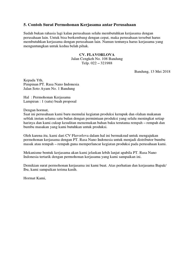 Contoh surat permohonan kerjasama antar perusahaan. Contoh surat permohonan kerjasama. Surat permohonan kerjasama adalah surat yang dibuat oleh suatu perusahaan yang mana tujuannya digunakan untuk menawarkan kerjasama kepada perusahaan maupun organisasi lain yang mana pada umumnya berupa jasa atau barang. Tanpa adanya surat permohonan tersebut terasa tidak mungkin perusahaan dapat berkembang dengan baik khususnya perusahaan yang masih dalam perncarian jati diri. Yang bertandatangan dibawah ini n a m a. Dalam lingkup bisnis surat penawaran kerjasama amatlah penting dan sangat sering digunakan oleh berbagai perusahaan. Contoh surat perjanjian kerjasama perusahaan posted by esemka di 3242016 105300 am perjanjian kerjasama.