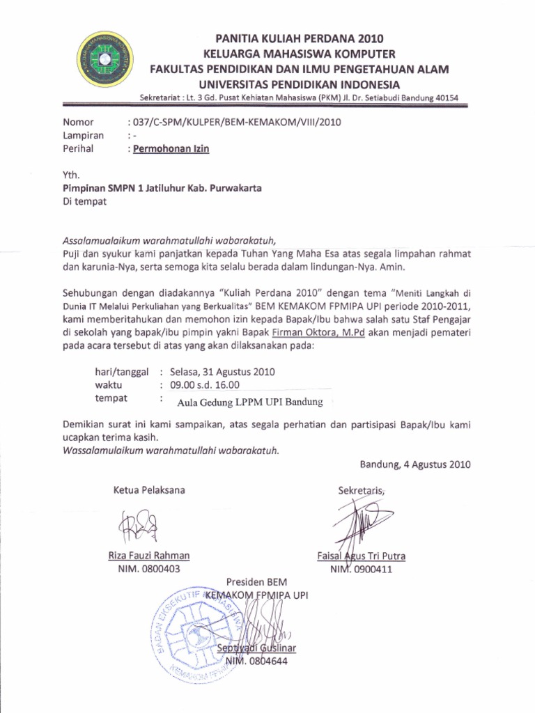 Contoh surat permohonan pembicara. Admin blog kumpulan surat penting 2019 juga mengumpulkan gambar gambar lainnya terkait surat permohonan sebagai pembicara dalam seminar dibawah ini. Contoh surat permohonan menjadi pemateri pembicara acara seminar itulah surat permohonan sebagai pembicara dalam seminar yang dapat admin kumpulkan. Biasanya surat permohonan pembicara ini harus dibuat dan disampaikan kepada orang yang ingin kita jadikan pembicara maksimal 2 minggu sebelum hari h karena agar orang yang akan menjadi pembicara pada acara kegiatan kita dapat mempersiapkan diri atau karena dikhawatirkan calon pembicara ini tidak dapat hadir karena sudah ada acara penting lainnya. Simpan simpan contoh surat permohonan narasumber untuk nanti. Contoh surat permohonan seminar. Wassalamu alaikum warahmatullahi wabarakaatuh.