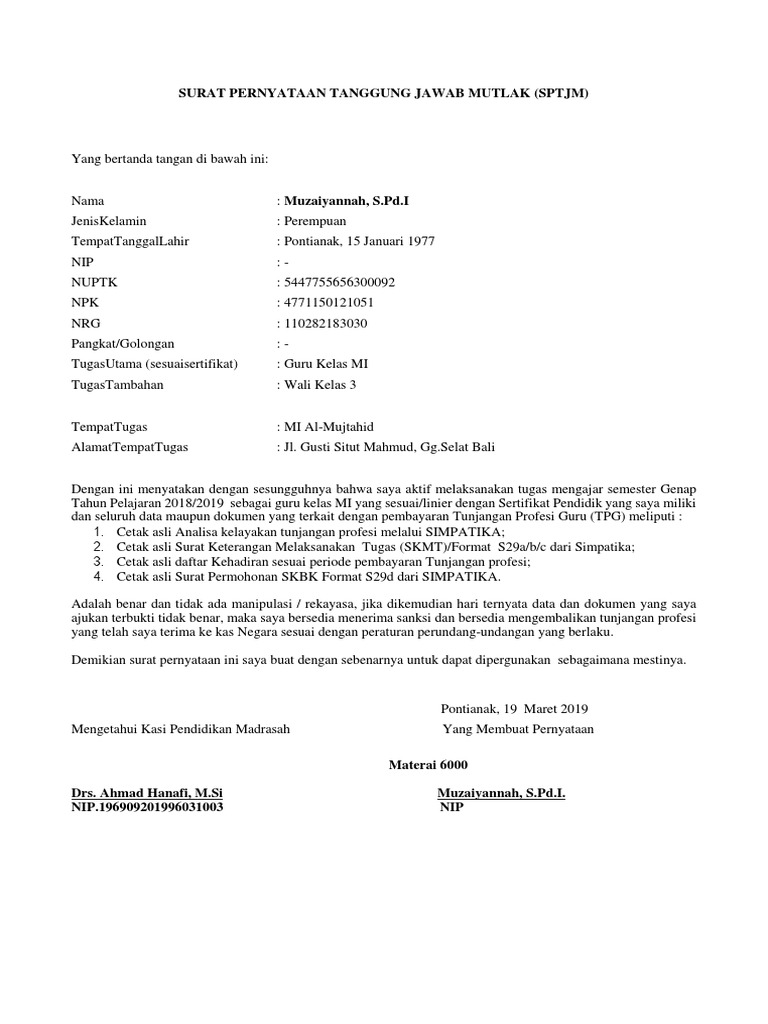 Di dalam surat pernyataan harus berisi nama si pembuat pernyataan dan nuptk serta instansi sebagai data pendukung kemudian tandatangani diatas materai 6000 sebagai bukti memperkuat bahwa pernyataan tersebut memang benar. Namun untuk urusan komunikasi perusahaan maupun berbagai lembaga maupun instansi pemerintah penggunaan surat masih merupakan sesuatu hal yang wajib untuk dilakoni. Contoh surat pernyataan belum berkualifikasi s1d4 sebagai persyaratan untuk upload dokumen bantuan pemerintah bagi guru tk sd smp smasmk dan slb tahun 2019 untuk lanjut studi s1d4. Surat pernyataan adalah surat yang dibuat untuk menyatakan bahwa seseorang telah atau tidak pernah melakukan suatu hal. Pada postingan ini admin akan membagikan contoh surat pernyataan belum berkualifikasi s1d4 buat gurutenaga kependidikan yang telah berhasil registrasi di website banpem pastinya sekarang sedikit sudah legah karena sudah berhasil masuk ke laman kemendikbud banpem bagi guru untuk lanjut studi s1. 15 contoh surat pernyataan paling lengkap untuk berbagai kebutuhan belakangan ini penggunaan surat memang bisa dibilang sudah semakin minim terlebih untuk urusan pribadi.