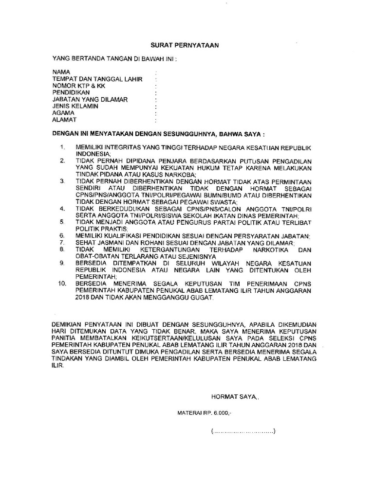 Contoh surat pernyataan cpns. Contoh format surat pernyataan cpns format surat pernyataan cpns bagi sebagian pelamar memang gampang gampang susah. Contoh surat pernyataan cpns surat pernyataan cpns merupakan salah satu persyaratan yang harus dilengkapi oleh calon peserta ujian cpns. Bagi pelamar seleksi cpns kemendikbud 2019 yang ingin mengunduh contoh surat pernyataan di atas dalam format pdf bisa men download nya melalui tautan ini. Surat pernyataan cpns 2017 ini merupakan syarat kelengkapan berkas dalam seleksi administrasi cpns 2016. Silahkan dibaca melalui link ini karena terdapat juga informasi penting lainnya. Jadi anda tidak perlu repot repot harus mengetik ulang format surat lamaran tersebut cukup mengganti nama.
