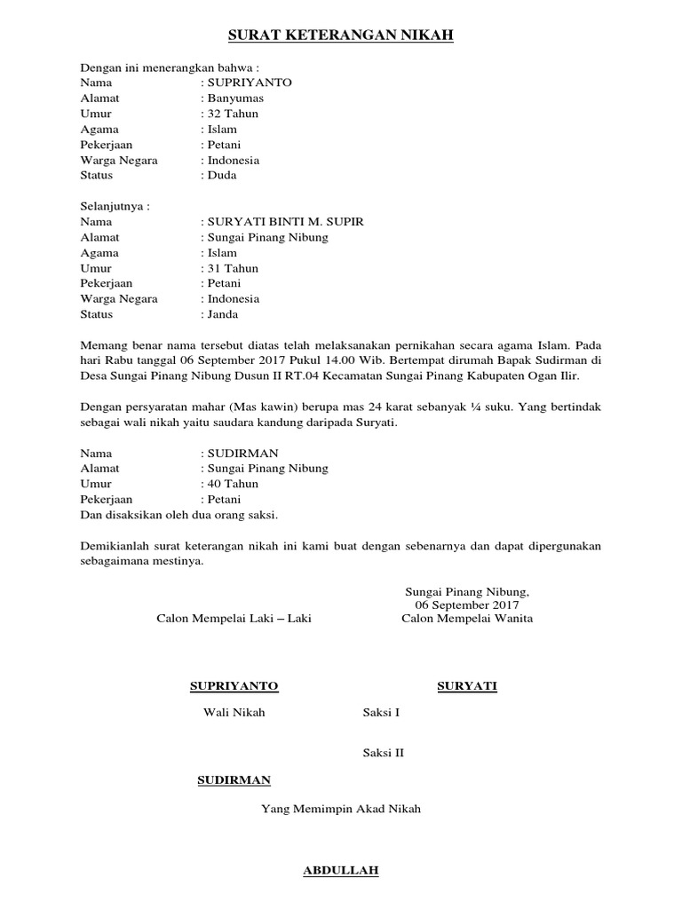Contoh surat pernyataan nikah. Download contoh surat nikah siri format doc. Jika salah satu dari dua parameter belum terpenuhi pernikahan tidak dapat secara resmi diakui di negara ini. Namun apapun alasannya yang jelas nikah siri itu tidak akan dianggap ada oleh negara meskipun dari segi agama nikah siri sah sah saja. Karena disini pasangan nikah tak mendapat surat nikah legal dari negara. Terlebih jika penggunaan surat untuk komunikasi pribadi maka surat sudah sangat jarang kita temui. Namun tentunya masalah pernikahan tidak sepenuhnya ditentukan oleh manusia.