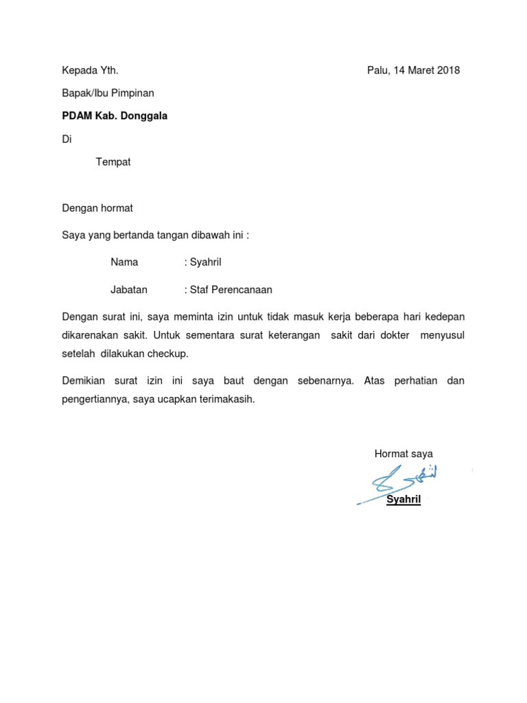 Contoh surat sakit kerja. Contoh surat izin sakit tidak masuk kerja pns. Pada kesempatan sebelumnya kita telah membahas mengenai contoh surat lamaran kerja umum yang baik dan benarnah kali ini kita akan membahas mengenai contoh surat izin tidak masuk kerja yang benar 2019. 21 contoh surat izin tidak masuk kerja lengkap. Wajar jika suatu saat tubuh mengalami gangguan kesehatan sehingga dibutuhkan waktu untuk istirahat. Surat izin adalah salah satu surat yang berisi tentang keterangan bahwa seorang yang membuat surat tersebut untuk meminta izin pada sebuah alasan melakukan sesuatu di luar tugas wajib yang dilakukan. Lain dengan perusahaan swasta biasanya izin tidak masuk kerja untuk seorang pns yang bekerja baik di dunia pendidikan atau kedinasan lainnya akan sedikit lebih rumit.