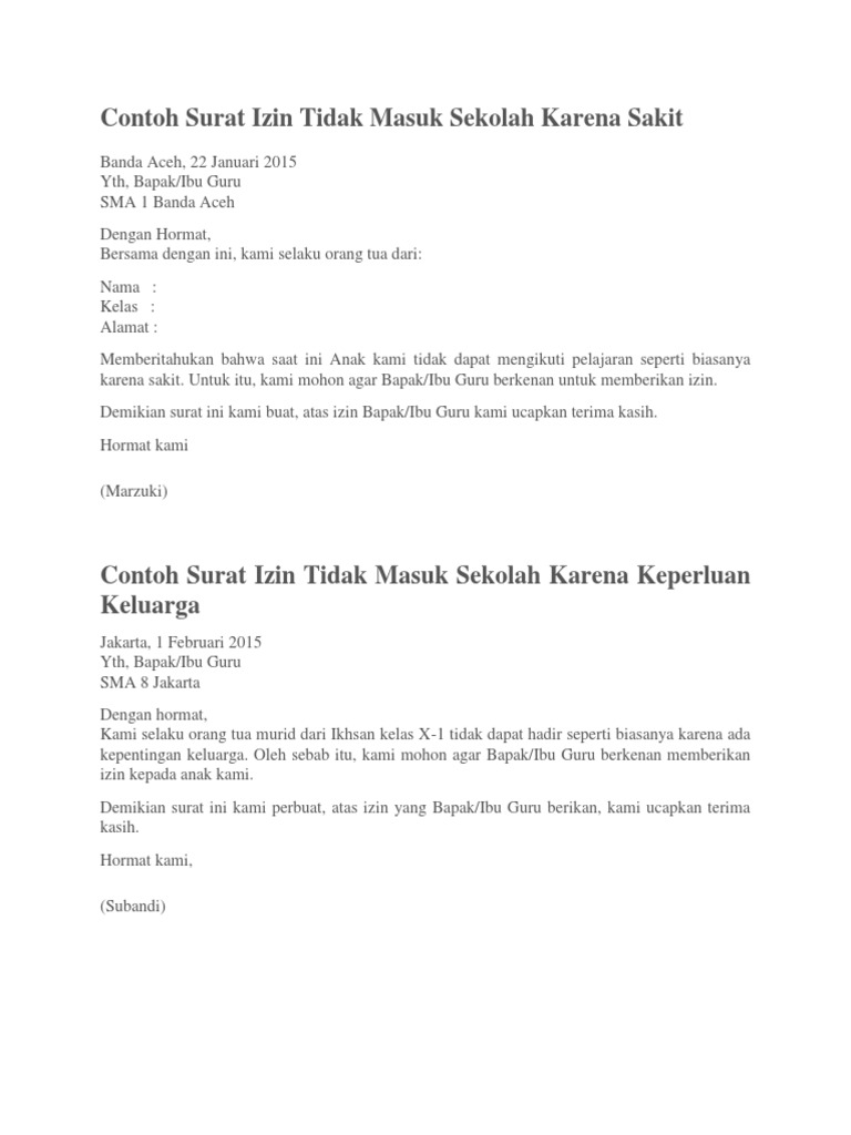 Walaupun memang sudah jarang digunakan untuk komunikasi urusan pribadi namun penggunaan surat ini masih sangat sering digunakan pada berbagai kantor instansi pemerintahan sampai dengan lembaga dan perusahaan. Meskipun surat ini masih tergolong sebagai surat pribadi dalam penulisan surat izin sekolah ini berbeda saat kita menulis sebuah surat untuk teman kita. Ini atas sebab untuk memaklumkan kepada guru kelas anak anda dan ada alasan munasabah diberi jika tidak datang tanpa sebab akan menyebabkan bad rekod kemungkinan akan. Surat izin tidak masuk sekolah mempunyai tujuan untuk memberitahukan kepada pihak sekolah bahwa siswa yang tercantum namanya di surat tersebut berhalangan hadir untuk belajar di sekolah. Contoh surat pribadi untuk guru seiring dengan perkembangan zaman dan kecanggihan teknologi sekarang ini penggunaan surat sebagai alat komunikasi pribadi juga semakin berkurang dan banyak ditinggalkan oleh masyarakat. Rabu 15 februari 2017.