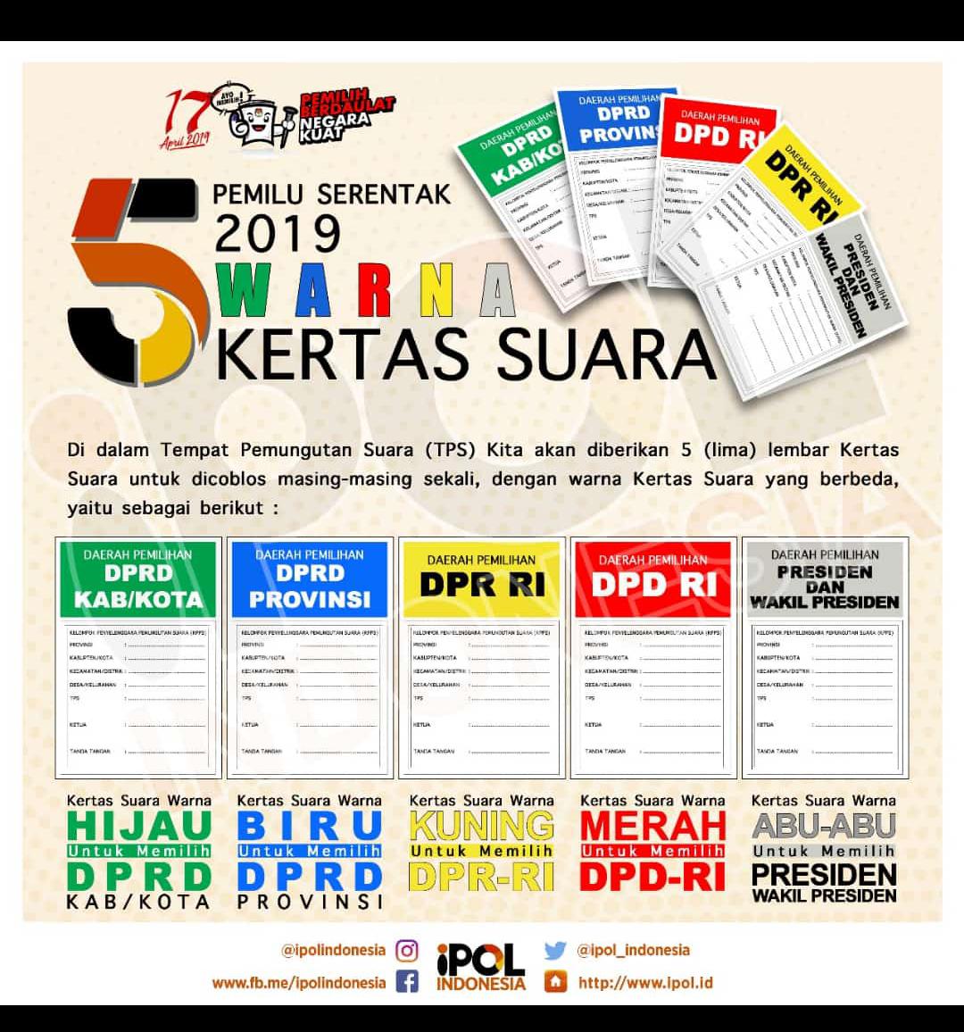 Perbedaan 5 warna surat suara bertujuan untuk memudahkan calon pemilih pada pemilu 2019 yang akan berlangsung 17 april 2019. Jumlah surat suara itu untuk pemilu legislatif dan pemilu presiden dan wakil presiden yang untuk pertama kalinya akan digelar serentak dalam satu hari. Ada 5 surat suara yang harus dicoblos di bilik suara pada pemungutan suara rabu 17 april 2019. Ditargetkan pada 17 maret 2019 surat suara pemilu sudah sampai di seluruh kabupatenkota. Mari kita sukseskan pemilu 2019 yang jatuh pada tanggal 17 april 2019 ayo ke tps. Mari kita sukseskan pemilu 2019 yang jatuh pada tanggal 17 april 2019 ayo ke tps.
