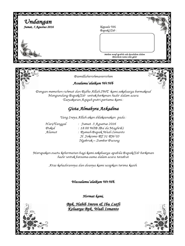 Academiaedu is a platform for academics to share research papers. Menutup surat dengan salam adalah salah satu bentuk sopan santun dalam membuat surat undangan. Oh iya sementara ini kami punya 2 contoh surat undangan aqiqah lainnya cekidot juga yhaa. Berikut penjelasan dari kedua format di atas. Semua anak bayi tergadaikan dengan aqiqahnya yang pada hari ketujuhnya disembelih hewan kambing diberi nama. Adiducation contoh undangan akikah desain terbaru 2018 aqiqah 2018.