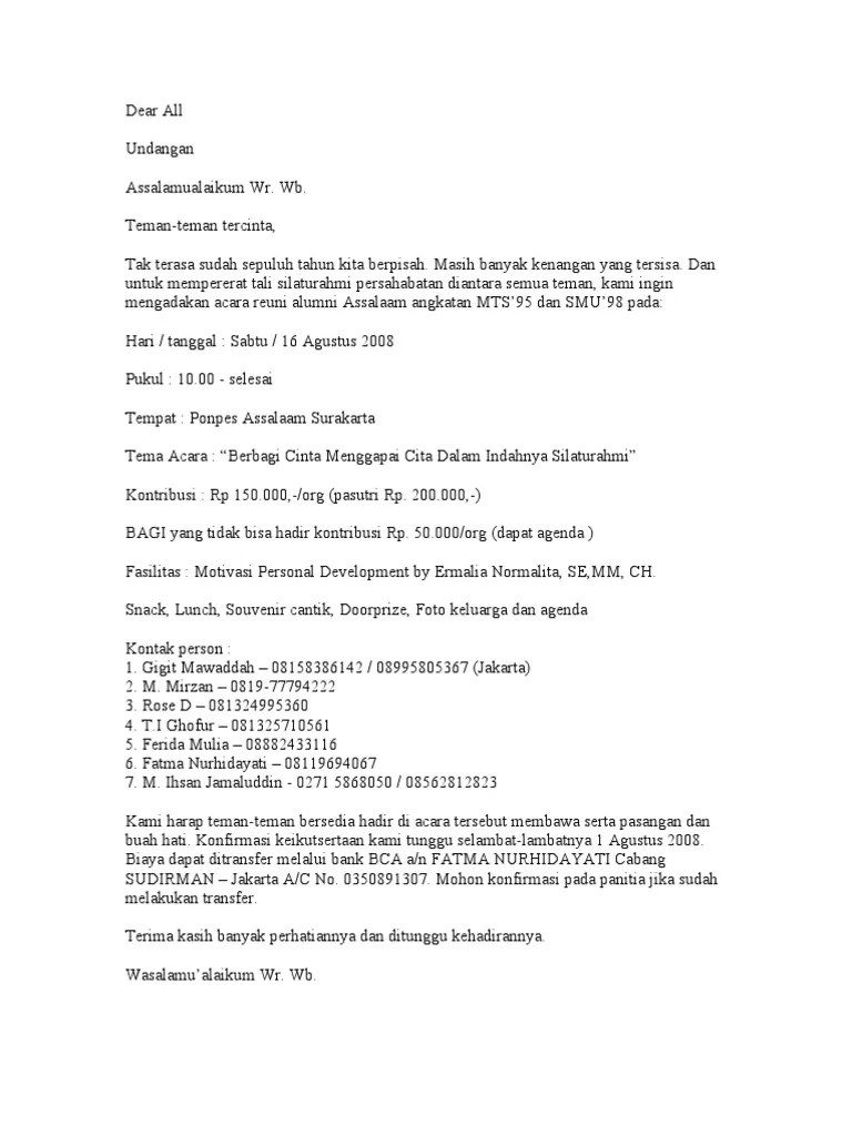 Untuk contoh surat undangan resmi nomer dua dimana tidak menyertakan alamat lengkap serta hal lain yang berkaitan dengan perusahaan dibuat demikian karena surat ditujukan pada salah seorang yang merupakan anggota perusahaan. Contoh surat undangan reuni reuni merupakan suatu kegiatan yang seringkali dilakukan dengan tujuan mempererat tali silaturahmi. Dan ini contoh surat undangan reuni download as word doc doc pdf file pdf. Ya sudah barang pasti kita semua sudah pernah menerima yang namanya undangan baik undangan yang formal ataupun yang non formal. Contoh surat undangan pada umumnya surat terbagi menjadi dua jenis yaitu surat resmi dan surat tidak resmi. Nah surat resmi biasa digunakan untuk tujuan acara yang resmi sedangkan surat tidak resmi digunakan oleh perseorangan atau untuk kepentingan yang bersifat pribadi.