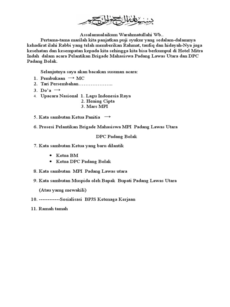 Contoh susunan acara pelantikan. Masing masing ketua sangga menyiapkan barisannya 2. Berikut ini link unduhan dari salah satu contoh susunan acara yang dapat bapak dan ibu gunakan sebagai pembawa acara. Download tata cara pelantikan. Markas cabang forum bersama laskar merah putih. Susunan acara upacara pelantikan penegak bantara hari. Selain tata cara pelantikan kepala daerah diatas pada perpres ini juga memuat tata cara serah terima jabatan perlengkapan dalam acara pelantikan dan undangan pada acara tersebut.