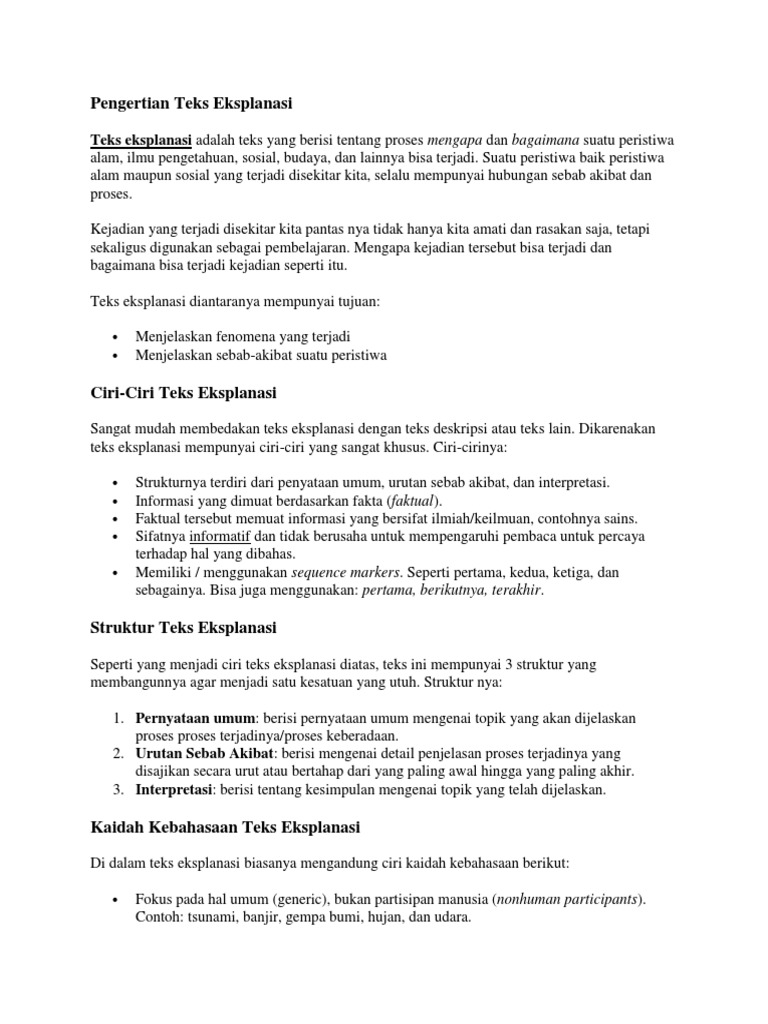 Untuk pembahasan kali ini kami akan memberikan ulasan mengenai contoh teks eksplanasi yang dimana dalam hal ini meliputi contoh beserta strukturnya lengkap nah agar lebih dapat memahami dan mengerti simak ulasan selengkapnya dibawah initeks adalah teks yang menjelaskan tentang proses atau tahapan mengapa dan bagaimana terjadinya suatu fenomena atau peristiwa yang berkaitan. Lebih baik kamu baca dulu artikel. Pernyataan umum pembuka pelangi bahasa inggrisnya rainbow merupakan suatu peristiwa optik atau meterologi berwujud cahaya yang bermacam macam warna paralel satu dengan yang lainnya di langit atau juga media yang lain. Beberapa bencana alam yang kami singgung diatas akan kami jelaskan secara terperinci dalam bentuk contoh teks eksplanasi singkat beserta strukturnya. Eksplanasi berasal dari bahasa asing inggris yang berarti tindakan menerangkan atau menjelaskan dan keterangan pernyataan atau fakta yang menjelaskan the contemporary english indonesian dictionary. Contoh teks eksplanasi teks eksplanasi adalah media teks yang berisi proses tentang kenapa dan bagaimana suatu peristiwa bisa terjadi.
