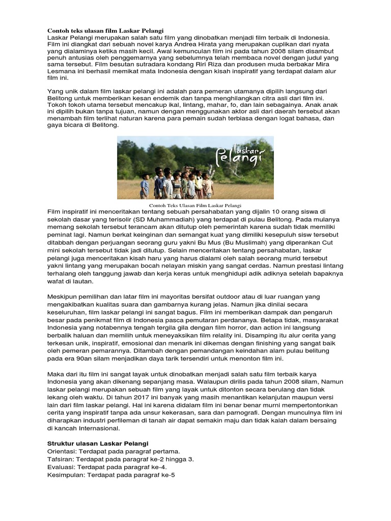 Contoh teks ulasan film laskar pelangi singkat dan struktur written by ivanwira friday march 3 2017 add comment semuacontoh yoo para pembaca dan pelajar kali ini saya akan membagikan contoh singkat teks film indonesia laskar pelangi yang merupakan salah satu materi pembelajaran bahasa indonesia yang mungkin teman teman butuhkan untuk referensi mengerjakan tugas. Berikut dipaparkan sebuah struktur dari teks prosa fiksi berbentuk novel.