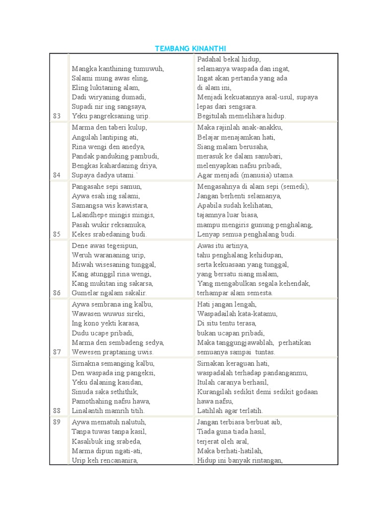 Di masa ini manusia juga sedang giat giatnya untuk meraih cita cita sehingga memerlukan tuntunan dari orang yang lebih mengerti. Tembang ini merupakan gambaran fase dimana manusia telah menginjak masa dewasa dan kental akan labelling sebagai masa mencari jati diri. Artinya pada tembang kinanthi ini baris permama terdiri dari 8 suku kata pada baris kedua terdiri dari 8 suku kata dan pada baris larik ke tiga tersiri dari 8 suku kata begitu seterusnya. Contoh tembang kinanthi 8u 8i 8a 8i 8a 8i kukusing dupa kumelun ngeningken tyas kang apekik kawengku sagung jajahan nanging saget angikipi sang resi kaneka putra kang anjog saking wiyati berikut penjelasan mengenai aturan guru gatra guru lagu dan guru wilangan dari tembang kinanthi. Biasanya macapat diartikan sebagai maca papat papat membaca empat empat yaitu maksudnya cara membaca terjalin tiap.
