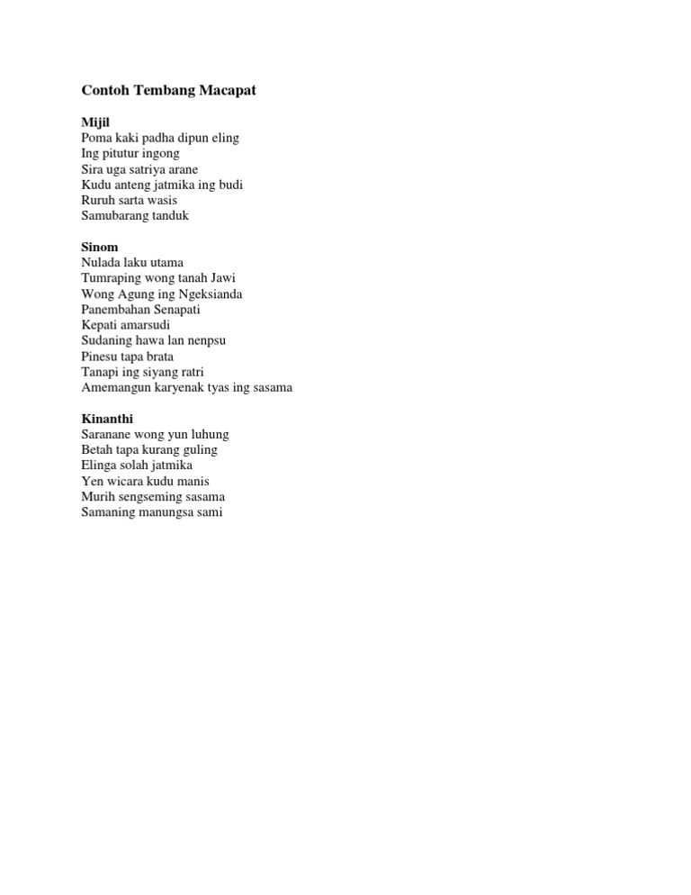 Tembang macapat macapat merupakan tembang atau puisi tradisional jawa. Sesorah utawa pidhato basa jawa. Contoh tembang kinanthi kinanthi 1 by. Nah pada kesempatan kali ini saya akan membagikan beberapa. Dalam tembang ini manusia memiliki otak yang berperan penting sebagai wadah menyimpan semua pengalaman manusia saat usia kecil yang akhirnya nanti akan dijadikan menjadi sebuah sikap. Contoh tembang kinanthi tembang macapat kinanthi sama halnya dengan tembang macapat yang lain tembang ini mempunyai arti yang sangat dalam serta luhur.
