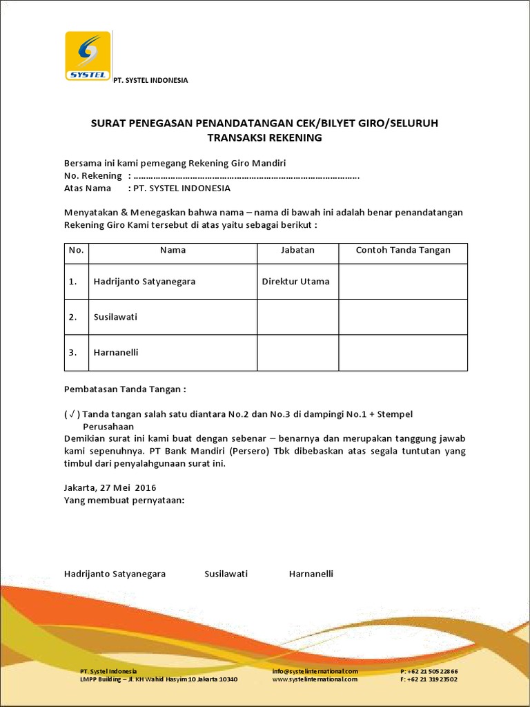 Karenanya ia bisa memberi pelimpahan wewenang pada orang lain dengan dibuktikan dengan surat pelimpahan wewenang atau umum di kenal dengan surat kuasa. Penulisan tanda tangan dengan atas nama biasanya dilakukan oleh orang lain yang bukan orang yang seharusnya menandatangani. Contoh surat resmi yang dibuat oleh individu adalah surat lamaran kerja atau surat pengunduran diri dimana cara penulisan surat tersebut menggunakan. A kecil diberi titik dan n kecil diberi titik digunakan jika penandatanganan dilakukan oleh pejabat setingkat di bawah pimpinan yang ditunjuk oleh pimpinan instansi yang bersangkutan. Syaratnya adalah si penandatangan telah mendapat persetujuan terlebih dahulu dari orang yg seharusnya menandatangani dan pada akhir surat dibuatkan termbusan kepada orang yang seharusnya menandatangani. Dicantumkan di depan nama jabatan yang melimpahkan wewenang penandatanganan itu.