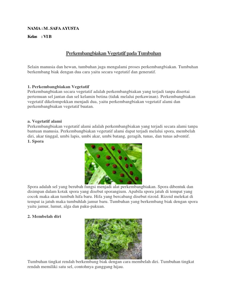 Tentu saja pada perkembangbiakan generatif merupakan proses jatuhnya benang sari pada putik yang kemudian di ikuti dengan proses pertemuan sel gamet. Memberikan contoh tumbuhan yang dapat dikembangbiakkan dengan cara vegetatif buatanalami. Seperti tumbuhan yang bisa berkembang biak melalui cara aseksual atau perkembangbiakan vegetatif yakni dibagi atas vegetatif alami dan vegetatif. Contoh perkembangbiakan vegetatif alami pengertian perkembangbiakan vegetatif pada tumbuhan adalah cara reproduksi suatu tumbuhan tanaman yang dilakukan secara aseksual atau tanpa adanya peleburan antara suatu sel kelamin jantan serta betina dan bisa dikatakan bahwa perkembangbiakan ini terjadi tanpa adanya perkawinan. Perkembangbiakkan tumbuhan vegetative merupakan cara berkembang biak tumbuhan yang dilakukan oleh dirinya sendiri tanpa dengan bantuan dari manusia. Selain dengan cara aseksual perkembangbiakan tumbuhan juga dilakukan dengan cara seksual atau disebut perkembangbiakan generatif.