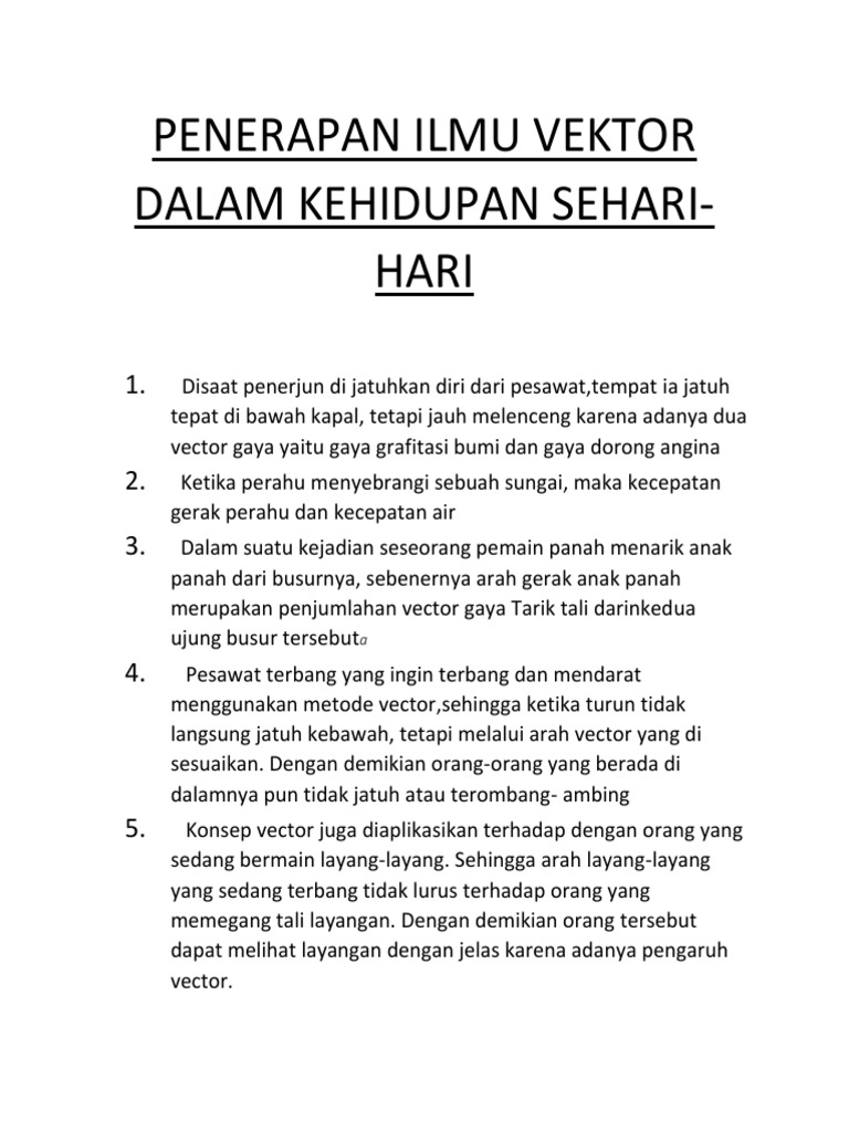 Contoh vektor dalam kehidupan sehari hari. Misalkan seseorang ingin menyeberang sungai menggunakan perahu dengan kecepatan x ms. Contoh penerapan vektor dalam kehidupan sehari hari berikut ini adalah beberapa contoh vektor dalam kehidupan sehari hari yang mungkin tidak asing lagi bagi kita semua. Selanjutnya kita akan mempelajari tentang perkalian vektor. Vektor memiliki peranan yang sangat penting dalam bidang fisika dan teknik. Yang bisa digunakan untuk melengkapi administarsi guru yang dapat di unduh secara gratis dengan menekan tombol download. Tujuan dalam pembuatan makalah ini adalah selain untuk memenuhi salah satu tugas mata kuliah kalkulus vektor dan juga agar pembaca tidak membuat opini bahwa mata kuliah ini tidak membosankan dan dianggap sulit bagi kalangan siswa dan mahasiswa.