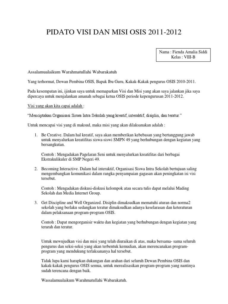 Menjadikan osis di sekolah nama sekolah yang progresif dinamis dan solid. Contoh visi misi osis contoh visi misi organisasi contoh visi misi bem contoh visi misi hidup contoh visi misi menikah dll. Boleh copy paste tapi jangan lupa cantumkan sumber. Mengajak para siswa untuk mengekspresikan diri melalui karya seni seperti seni musik dan seni rupa. Saat menjadi calon ketua dan wakil ketua osis kita tentunya harus membuat sebuah visi dan misi yang mampu menarik perhatian pemilih untuk memilih kita menjadi ketua dan wakil ketua osis. Mendorong siswa agar mampu untuk mengasah potensinya sendiri berdasarkan kreativitas yang sudah diberikan tuhan kepadanya.