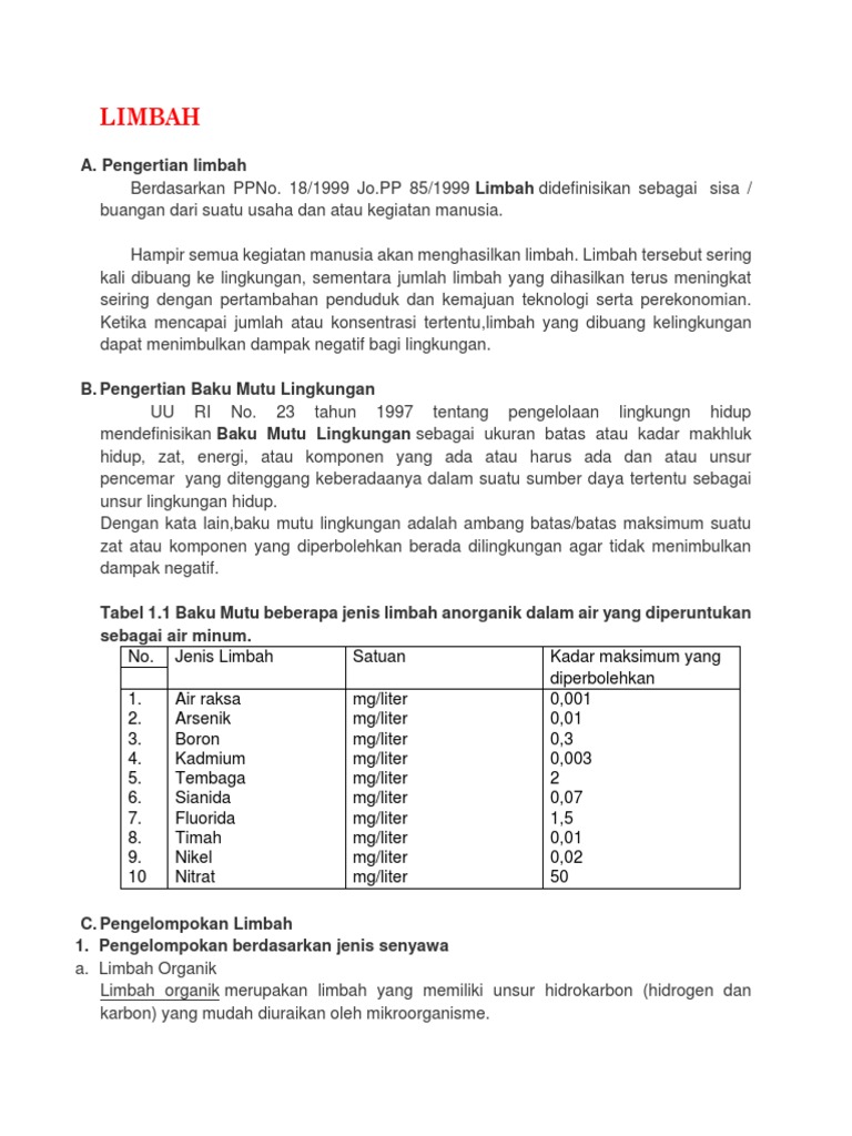 Limbah diartikan sebagai sisa hasil produksi atau buangan yang kehadirannya tidak lagi dikehendaki di lingkungan karena sudah tak memiliki nilai ekonomi serta ekologi. Jelaskan yang dimaksud dengan limbah b3 dan sebutkan macamnya. Bahan kimia yang telah diketahui manfaatnya dikembangkan dengan cara membuat produk produk yang berguna untuk kepentingan manusia dan lingkungannya. Sebutkan contoh senyawa yang dapat digolongkan kedalam limbah bersifat reaktif. Berkembangnya ilmu pengetahuan dan teknologi telah menghasilkan produk produk industri yang dapat memenuhi kebutuhan manusia sehari hari. Unsur adalah zat murni yang dapat diuraikan lagi menjadi zat lain yang lebih sederhana dengan reaksi kimia biasa senyawa adalah zat yang terbentuk dari penggabungan unsur unsur dengan pembagian tertentu.